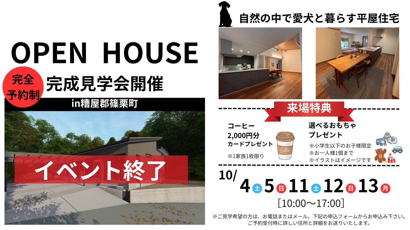 【完成見学会】自然の中で愛犬と暮らす平屋住宅in糟屋郡篠栗町 【10月4日(土)~10月5日(日)、10月11日(土)~13日(月)】